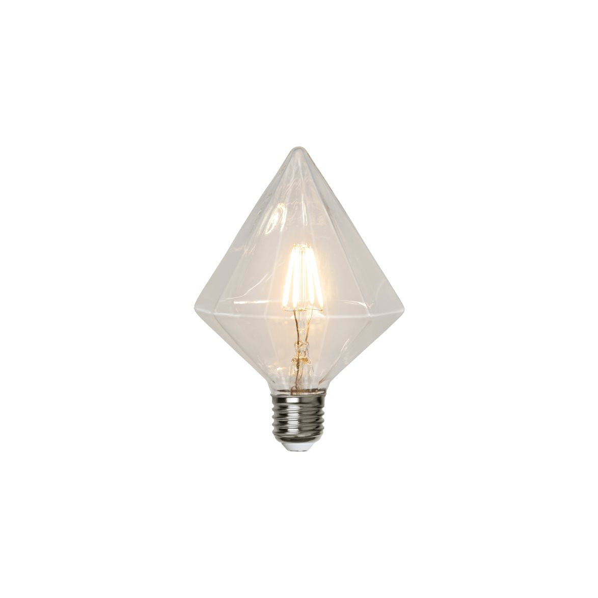 Detta är en LED-Globlampa från Star trading som är 115mm i diameter i diamantform. Sockeln är E27 och den ger 320lm vilket motsvarar en gammeldags 30W glödlampa. Höljet är klart och den har en färgtemperatur på 2700K vilket ger ett vanligt vitt ljus liknande en vanlig glödlampa.