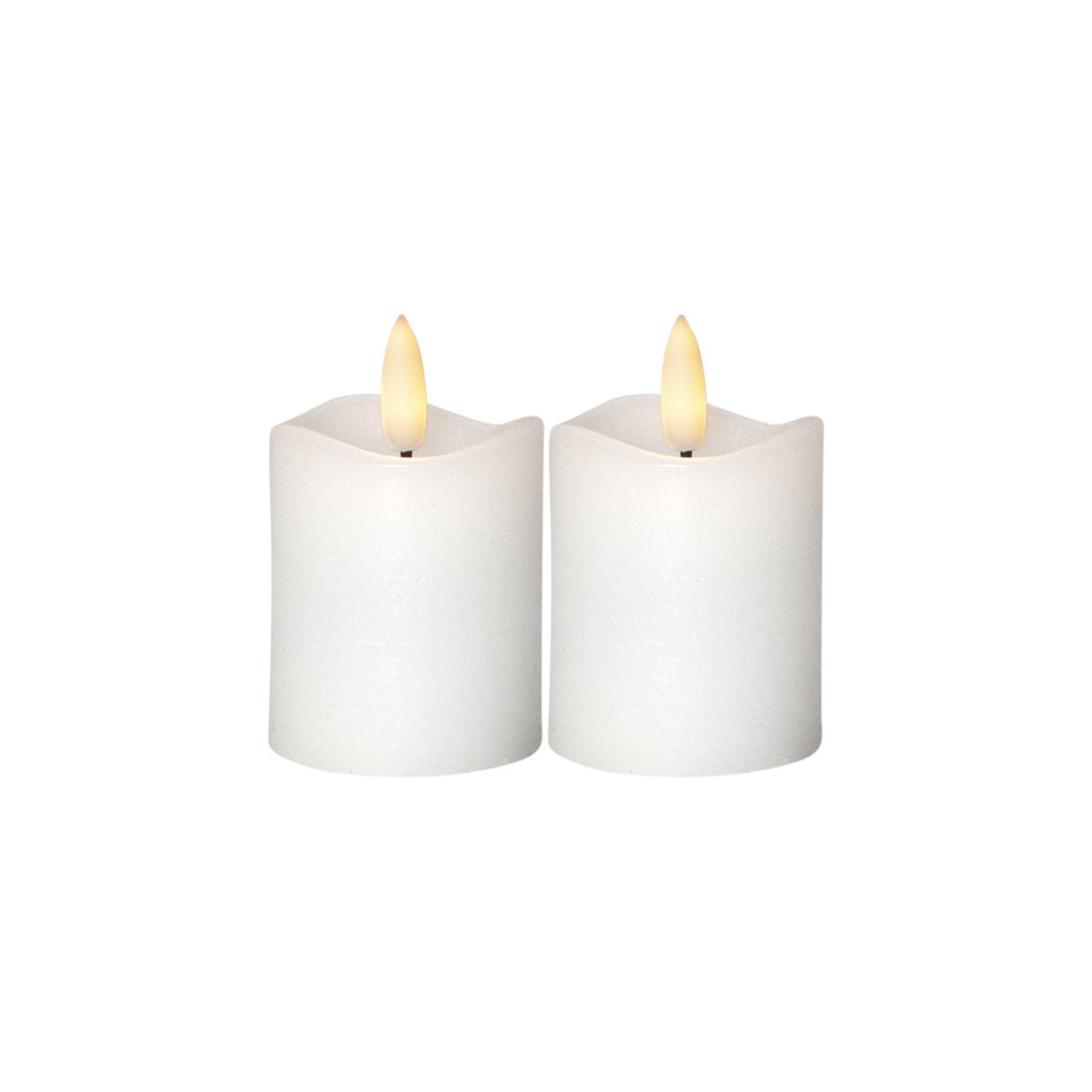 Batteriljus i litet blockljusmodell med mycket naturtrogen låga som lyser med varmvitt sken. De har en inbyggd timer som lyser i 6 timmar. Höjd 75mm och diameter 50mm. Levereras i 2-pack.
