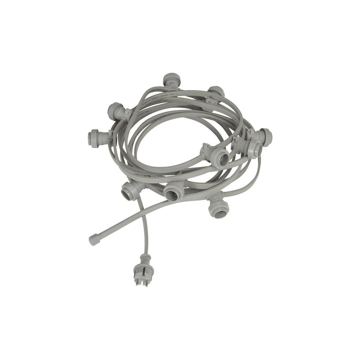 Här har vi en ljusslinga från PR Home med 10 st E27 lamphållare och grå gummikabel. Slingan med lampor är 4,5 meter med 2,5 meter anslutningssladd med en vanlig jordad stickpropp. Det är 0,5 meter mellan varje lampa. Den här ljusslingan är godkänd för utomhusbruk men går förstås självklart att även ha inomhus. Jag brukar kalla den här typen av ljusslinga för "dansbanebelysning" eftersom den ofta satt och sitter runt just dansbanor. Till denna följer det inte med några ljuskällor.