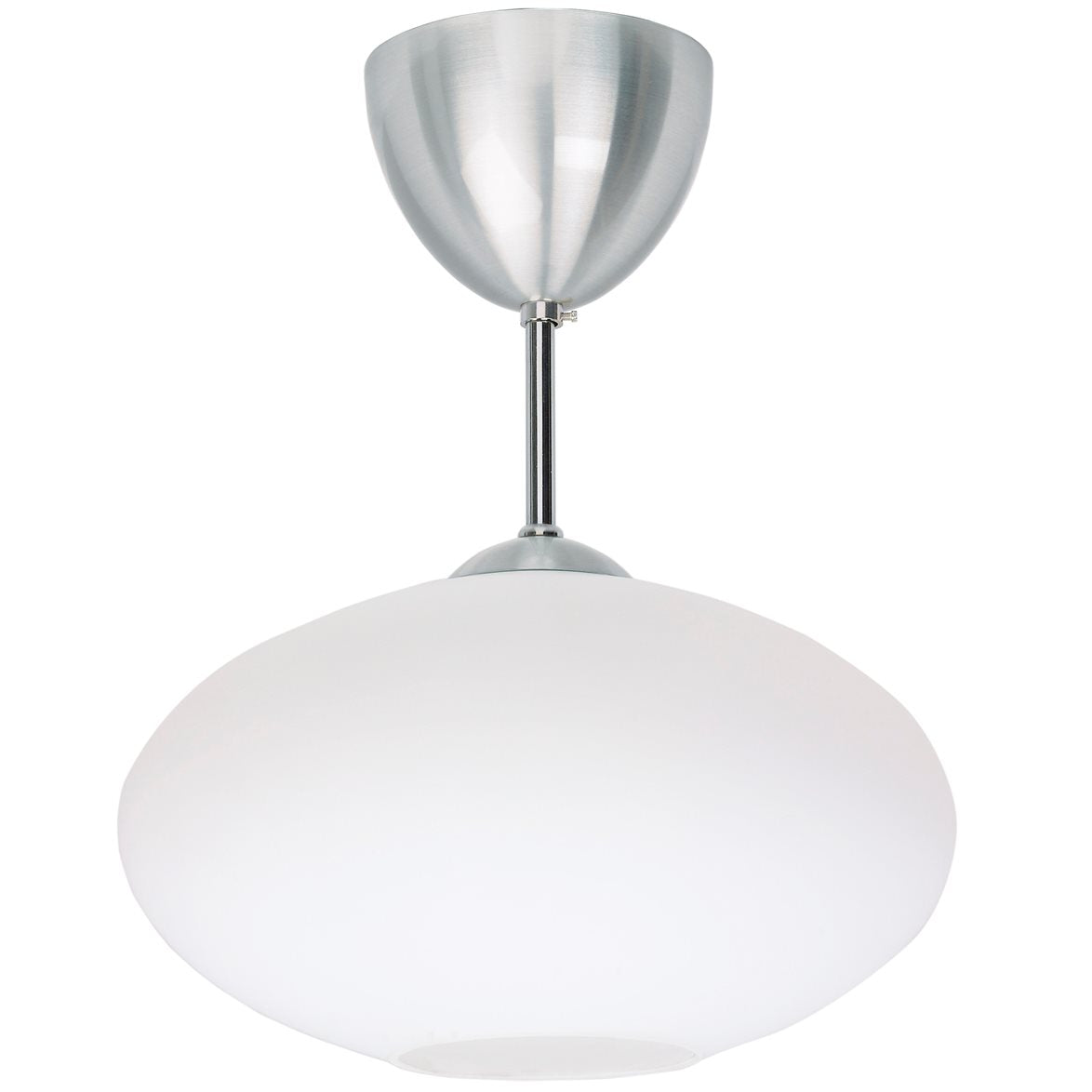 Bullo plafond är en mycket populär taklampa från svenska Belid. Den här modellen har ett aluminiumfärgat takfäste i borstad metall som utgörs av en cylinderformad stav som ansluter takkoppen med det rundade fäste lamphållaren är fäst vid. Runt lamphållaren finner vi ett opalglas i formen av en något tillplattad sfär med öppen botten. Till den här taklampan ingår ingen ljuskälla och du själv bestämmer vilken ljuskälla Du vill komplettera plafonden med. Oavsett vilken ljuskälla du väljer är det här en taklampa som tack vare den stora öppningen i botten gör det möjligt att enkelt byta ljuskälla. Vi på A-ljus tycker att den här taklampan är en riktig kameleont som både är tidlös och passar bra i allt från sovrum via matsal till badrum, vilket är en anledning till att den här modellen blivit så populär. Vi rekommenderar att använda den här mångsidiga plafonden som hall- eller sovrumslampa i ett rum där du har högt i tak. Bullo plafond är tillverkad i Sverige för Belid och finns även med kort fäste i opalglas samt i färgerna grå och oxid.