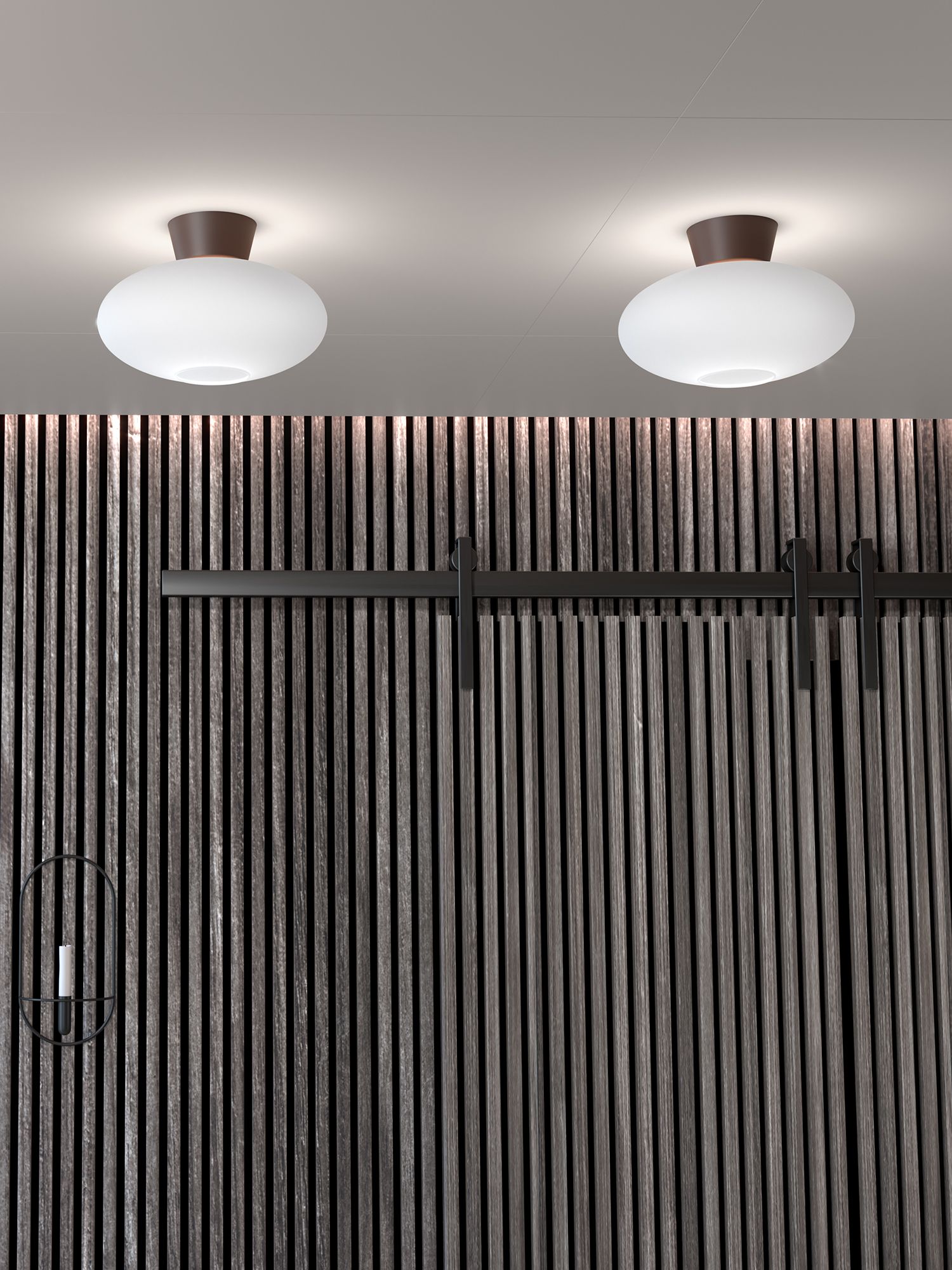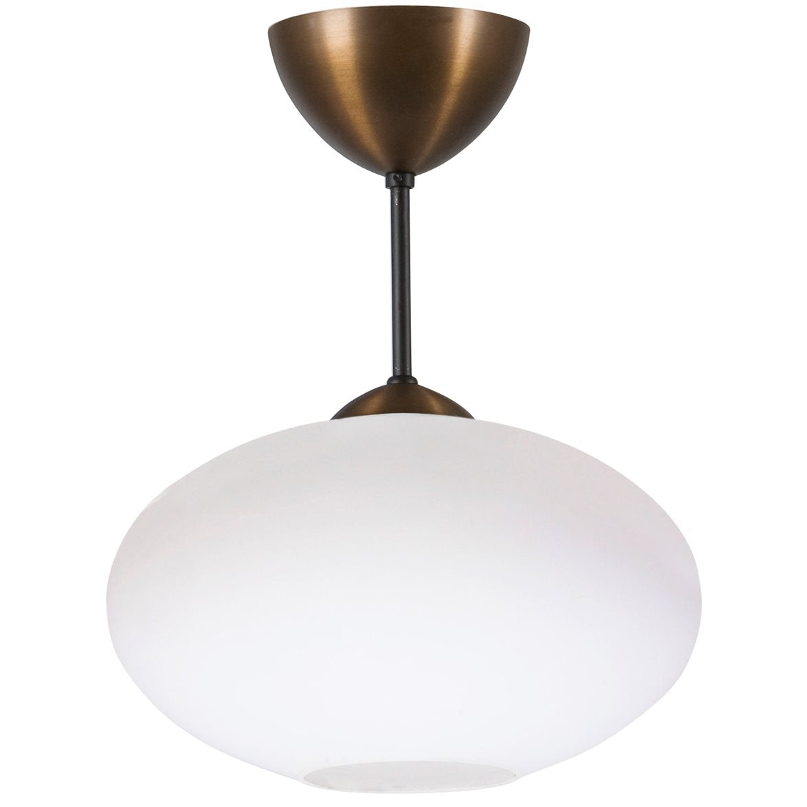 Bullo plafond är en mycket populär taklampa från svenska Belid. Den här modellen har ett oxidfärgat takfäste i borstad metall som utgörs av en cylinderformad stav som ansluter takkoppen med det rundade fäste lamphållaren är fäst vid. Runt lamphållaren finner vi ett opalglas i formen av en något tillplattad sfär med öppen botten. Till den här taklampan ingår ingen ljuskälla och du själv bestämmer vilken ljuskälla Du vill komplettera plafonden med. Oavsett vilken ljuskälla du väljer är det här en taklampa som tack vare den stora öppningen i botten gör det möjligt att enkelt byta ljuskälla. Vi på A-ljus tycker att den här taklampan är en riktig kameleont som både är tidlös och passar bra i allt från sovrum via matsal till badrum, vilket är en anledning till att den här modellen blivit så populär. Vi rekommenderar att använda den här mångsidiga plafonden som hall- eller sovrumslampa i ett rum där du har högt i tak. Bullo plafond är tillverkad i Sverige för Belid och finns även med kort fäste i både klar- och opalglas samt i färgerna aluminium och grå.