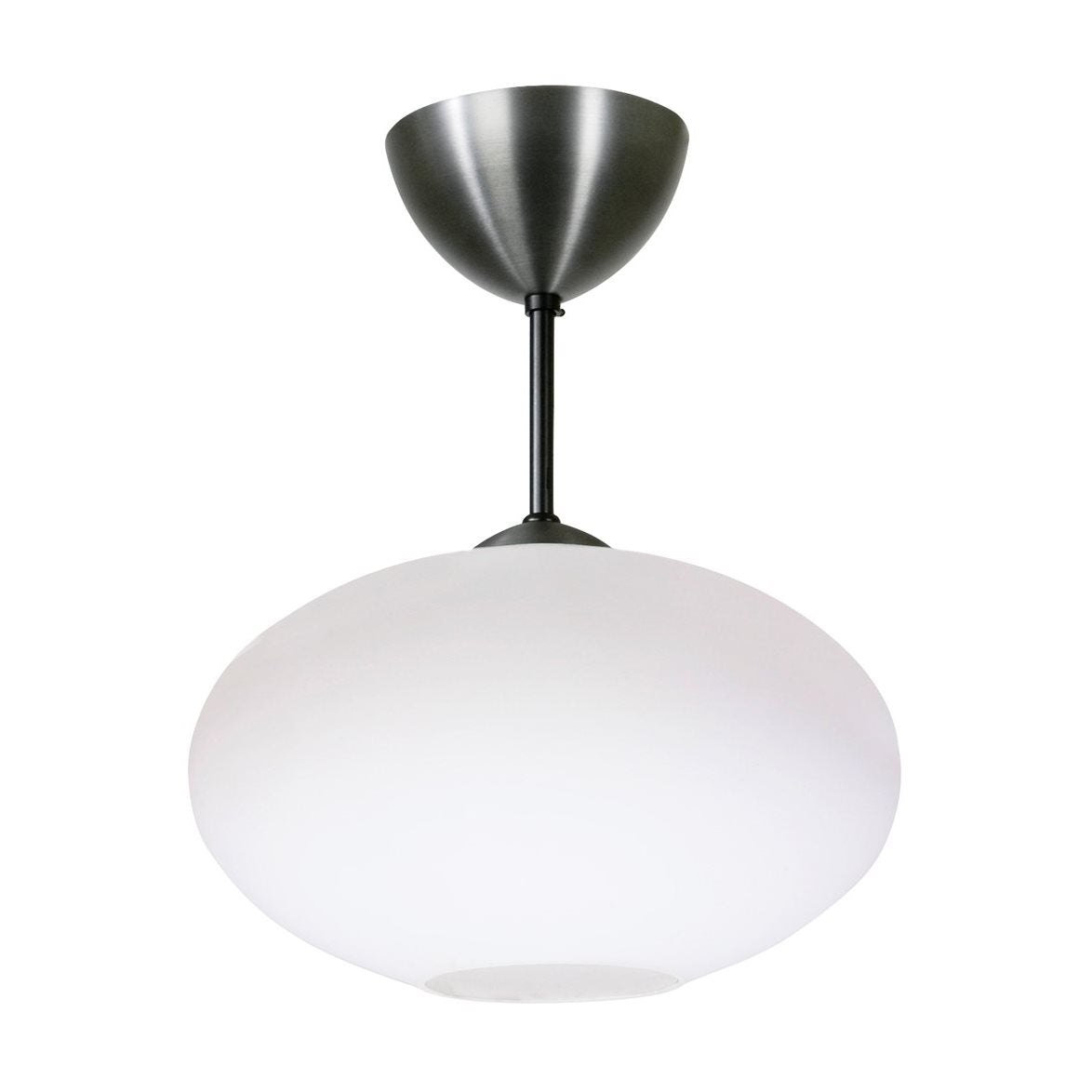 Bullo plafond är en mycket populär taklampa från svenska Belid. Den här modellen har ett oxidgrått takfäste i borstad metall som utgörs av en cylinderformad stav som ansluter takkoppen med det rundade fäste lamphållaren är fäst vid. Runt lamphållaren finner vi ett opalglas i formen av en något tillplattad sfär med öppen botten. Till den här taklampan ingår ingen ljuskälla och du själv bestämmer vilken ljuskälla Du vill komplettera plafonden med. Oavsett vilken ljuskälla du väljer är det här en taklampa som tack vare den stora öppningen i botten gör det möjligt att enkelt byta ljuskälla. Vi på A-ljus tycker att den här taklampan är en riktig kameleont som både är tidlös och passar bra i allt från sovrum via matsal till badrum, vilket är en anledning till att den här modellen blivit så populär. Vi rekommenderar att använda den här mångsidiga plafonden som hall- eller sovrumslampa i ett rum där du har högt i tak. Bullo plafond är tillverkad i Sverige för Belid och finns även med kort fäste i både klar- och opalglas samt i färgerna aluminium och oxid.