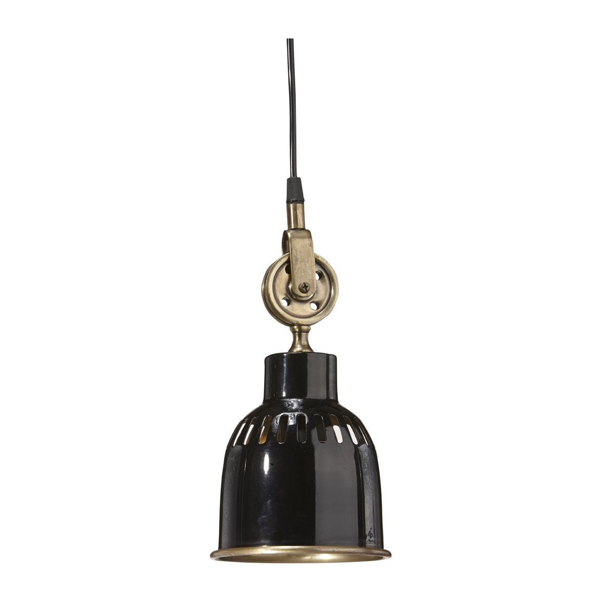 Det här är en rikitgt fin och prisvärd armaturserie från PR Home som heter Cleveland. Den består av en mindre och en större taklampa i antingen blanksvart eller mattgrått med detaljer i antikbehandlad mässing. Detta är den lilla Cleveland som består av en lampskärm i plåt som hänger i ett fäste som ser ut som ett litet metallhjul som du hittade på gamla hisslampor. Idag har detta hjul endast en dekorativ funktion. Metallskärmen är 140mm i diameter med en E27 sockel. På skärmen finns smala hål stansade så att ett visst ljus slipper ut. Lampans totala höjd är 230mm och sladden är svart och c:a 1,6 meter. Takkoppen är i samma material och färg som skärmen och klar för krokupphäng. Lilla Cleveland kan med fördel användas som fönsterlampa eller som liten taklampa över ett bord.