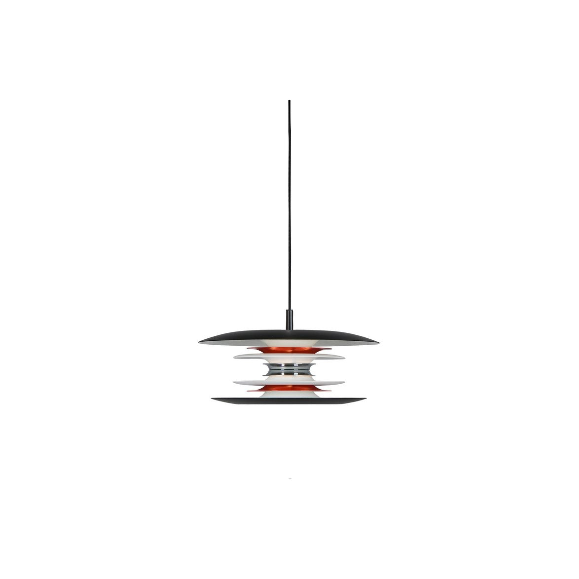 Diablo pendel i mattsvart/blankröd är en taklampa som är rund och består av olika plåtskärmar som ger ett dekorativt och bländfritt ljus. Skärmarna i pendeln ramar in ljuset på ett mjukt och vackert sätt och lampans levande uttryck ger ditt hem karaktär och personlighet. Designen passar sig lika bra över köksbordet som ovanför soffbordet. 2,8 meter svart textilsladd. Kom ihåg att komplettera med ljuskälla för sockel G9.