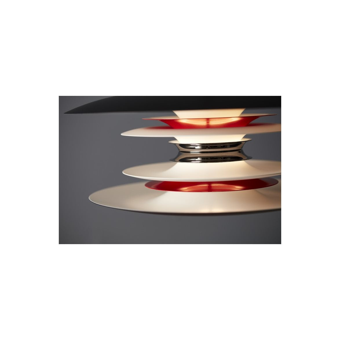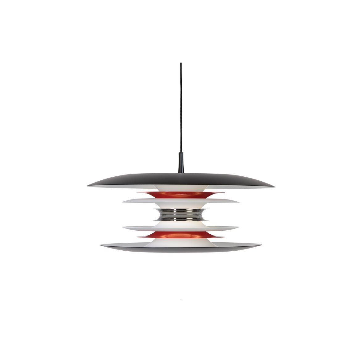 Diablo pendel i mattsvart/blankröd är en taklampa som är rund och består av olika plåtskärmar som ger ett dekorativt och bländfritt ljus. Skärmarna i pendeln ramar in ljuset på ett mjukt och vackert sätt och lampans levande uttryck ger ditt hem karaktär och personlighet. Designen passar sig lika bra över köksbordet som ovanför soffbordet. 2,8 meter svart textilsladd. Kom ihåg att komplettera med ljuskälla för sockel E27.