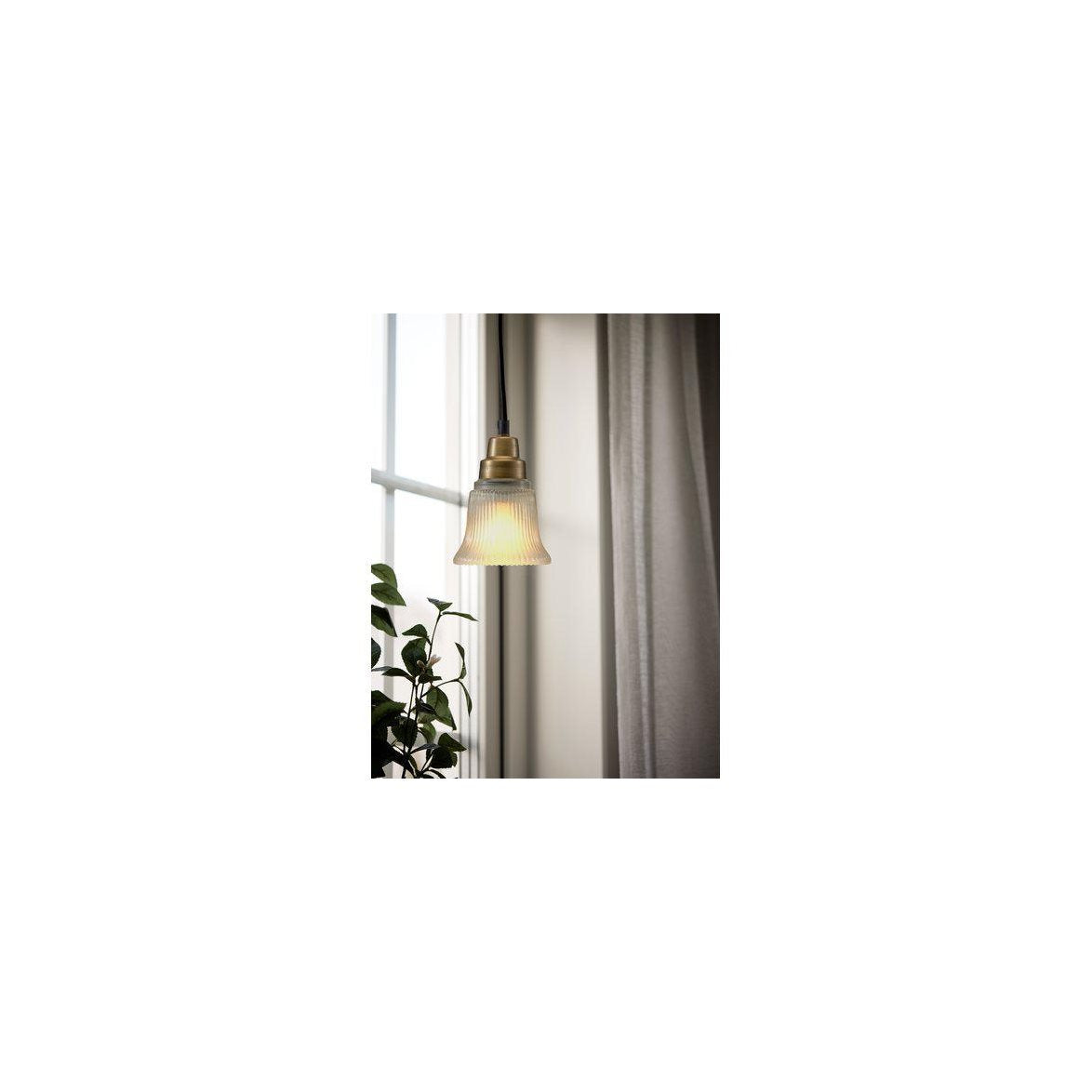 Emmi är en vacker fönsterlampa i klassisk modell. Ett klockformat ribbat glas och detaljer i metall med antikmässing finish. Svart textilkabel 3,5 m med väggkontakt. Diameter 12 cm, höjd 18 cm. E27 lamphållare. Kom ihåg att komplettera med en ljuskälla.