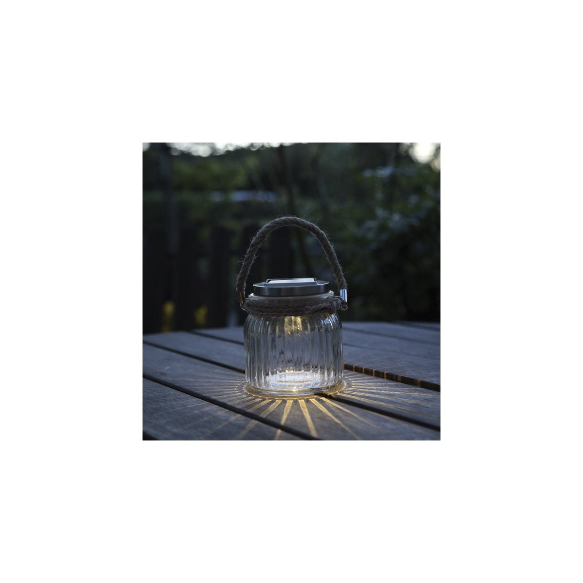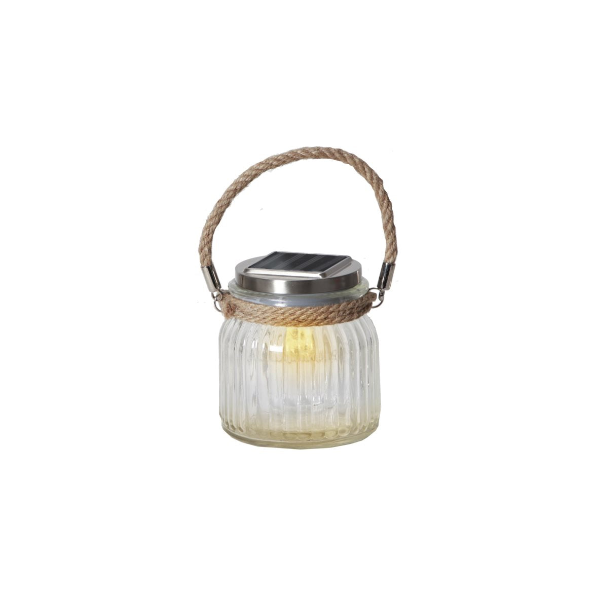Här är en solcellslampa som är mycket dekorativ att ställa på ett bord utomhus. Den har formen av en syltburk med ett varmvitt ljus från den lilla LED-lampan. Den är 120mm hög och 110mm i diameter.
