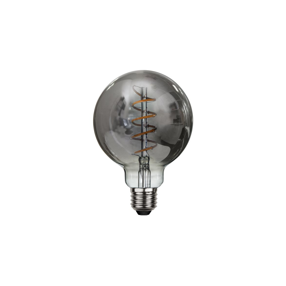 Detta är en LED-Globlampa från Star Trading som är 95mm i diameter. Sockeln är E27 och den ger 50lm vilket motsvarar en gammeldags 10W glödlampa . Glaset är rökfärgat och lampan har en färgtemperatur på 2100K vilket sprider ett varmt behagligt sken. RA90. Den är dimbar.