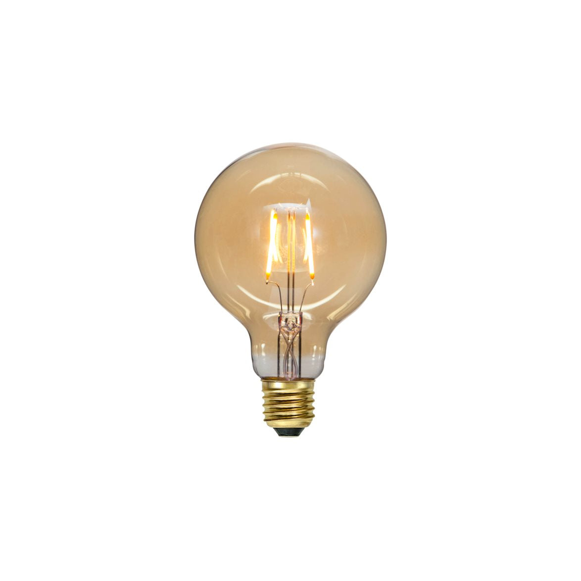 Dekorativ LED lampa glob 95 med ett vart amberfärgat sken. E27 sockel. Höjd 145mm och diameter 95mm. Effekt 0,75W. Energiklass F.