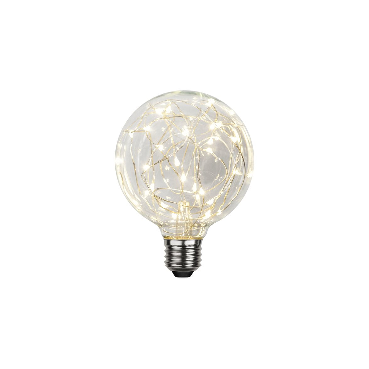 Detta är en LED-Globlampa från Star trading. Sockeln är E27 och den ger 45lm vilket motsvarar en gammeldags 5W glödlampa. Diametern på globen är 95mm och är Klar. Den har en färgtemperatur på 2900K vilket är varmvitt. Ljuskällan i globen är en så kallad Dew-drop-slinga vilket ger ett spännande sken. Det är 25 små LED på slingan.