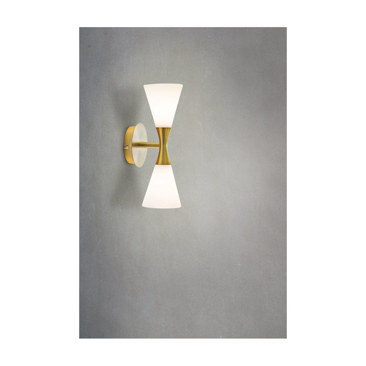 Harlekin är en vägglampa från Herstal med två strutformatde opalvita glas på ett centrerat väggfäste med 2x E14 socklar. Passar bra bredvid en spegel och i en trapp. Ljuskällor medföljer inte. Denna sockel är i borstad mässing eller nästan bronsfärgad.