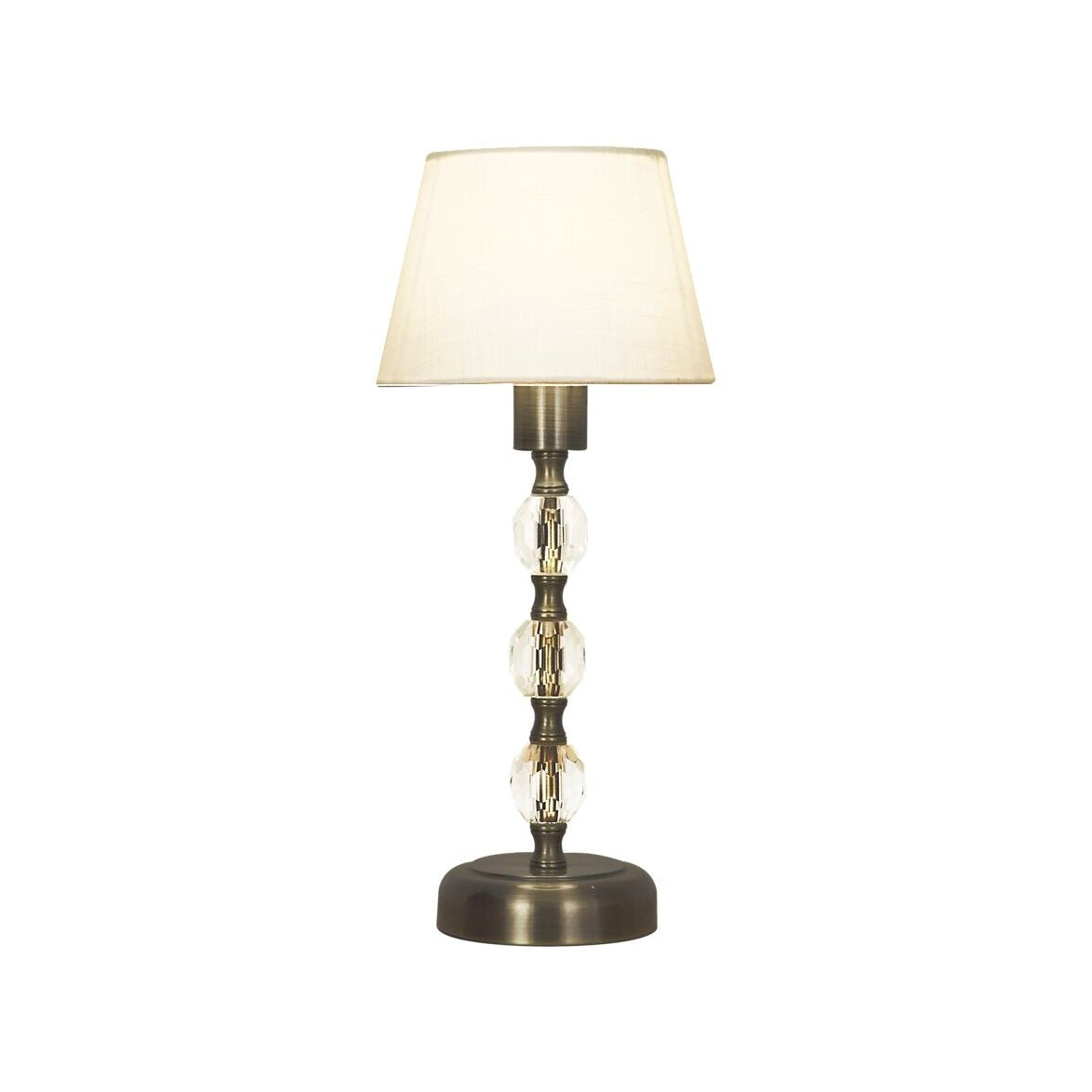 Johanna är en lite söt bordslampa som säljs komplett med lampfot och lampskärm. Foten är i antikmässingsfärg med klara kulor och lampskärmen är i textil och offwhite i färgen. Den ska bestyckas med en ljuskälla med E14 sockel.