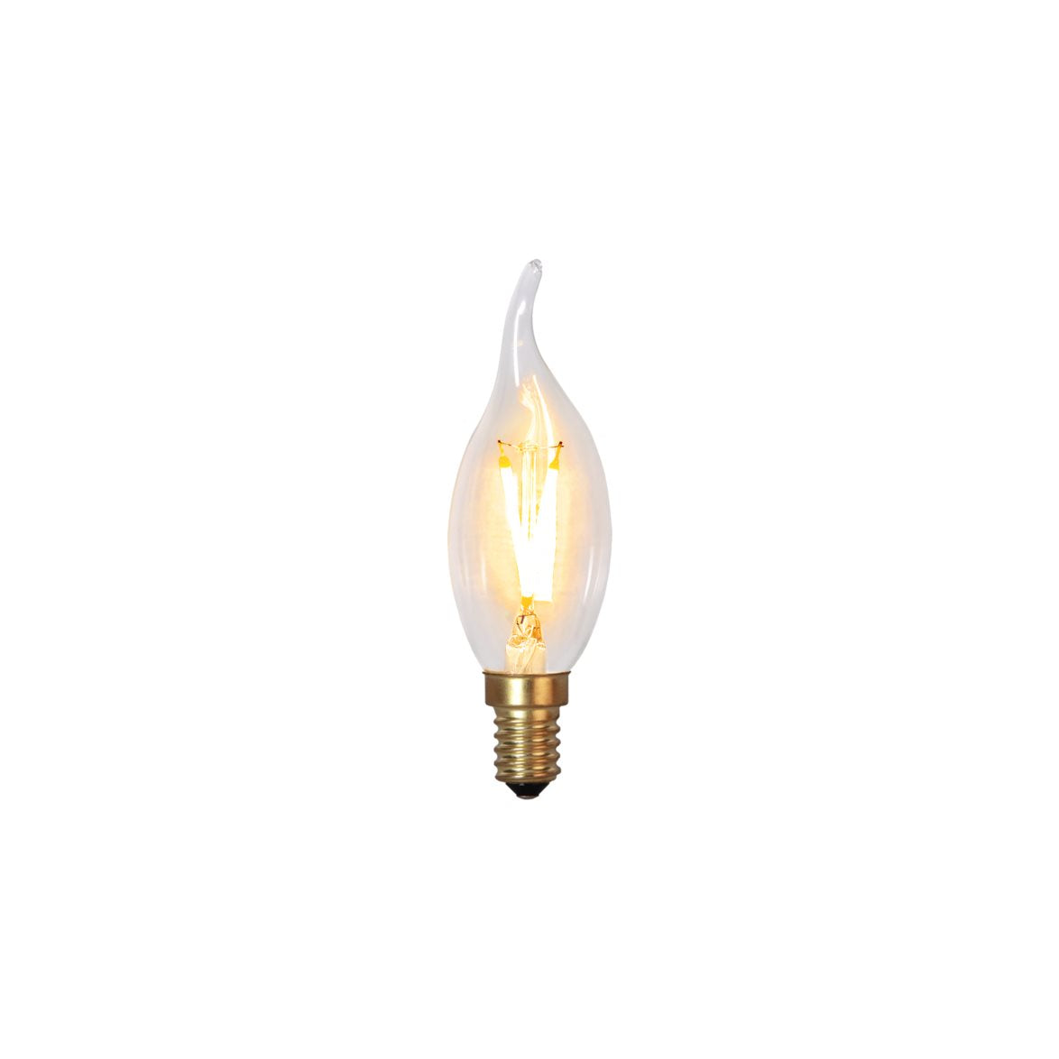 Detta är ett kronljus LED med filamentteknik med en dekorativ liten knorr på toppen av glaset. En fin ljuskälla att ha öppen i exempelvis en kristallkrona. Den har E14 sockel och ger endast 30 lumen och med varmt sken på 2100K.