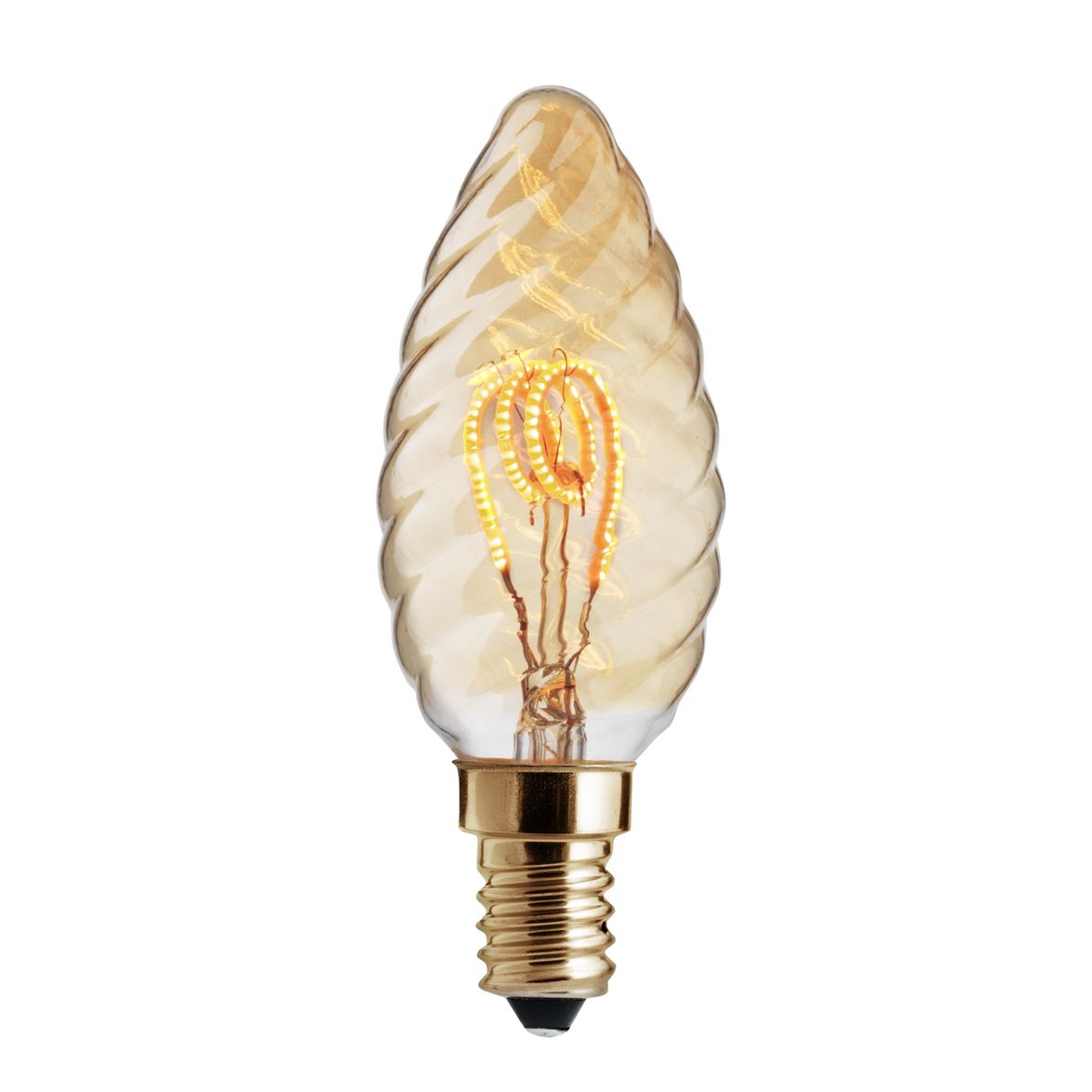 Detta är en LED-Vridet kronljus från Unison i serien UNI-FLEX. Sockeln är E14 och den ger 165lm vilket motsvarar en gammeldags 20W glödlampa. Kupan är amberfärgad (guld) och den har en färgtemperatur på 2000K vilket är mycket varmvitt. Glaset har en vriden spiralform vilket ger ett vackert sken i t.ex. kristallkronor. Dimbar