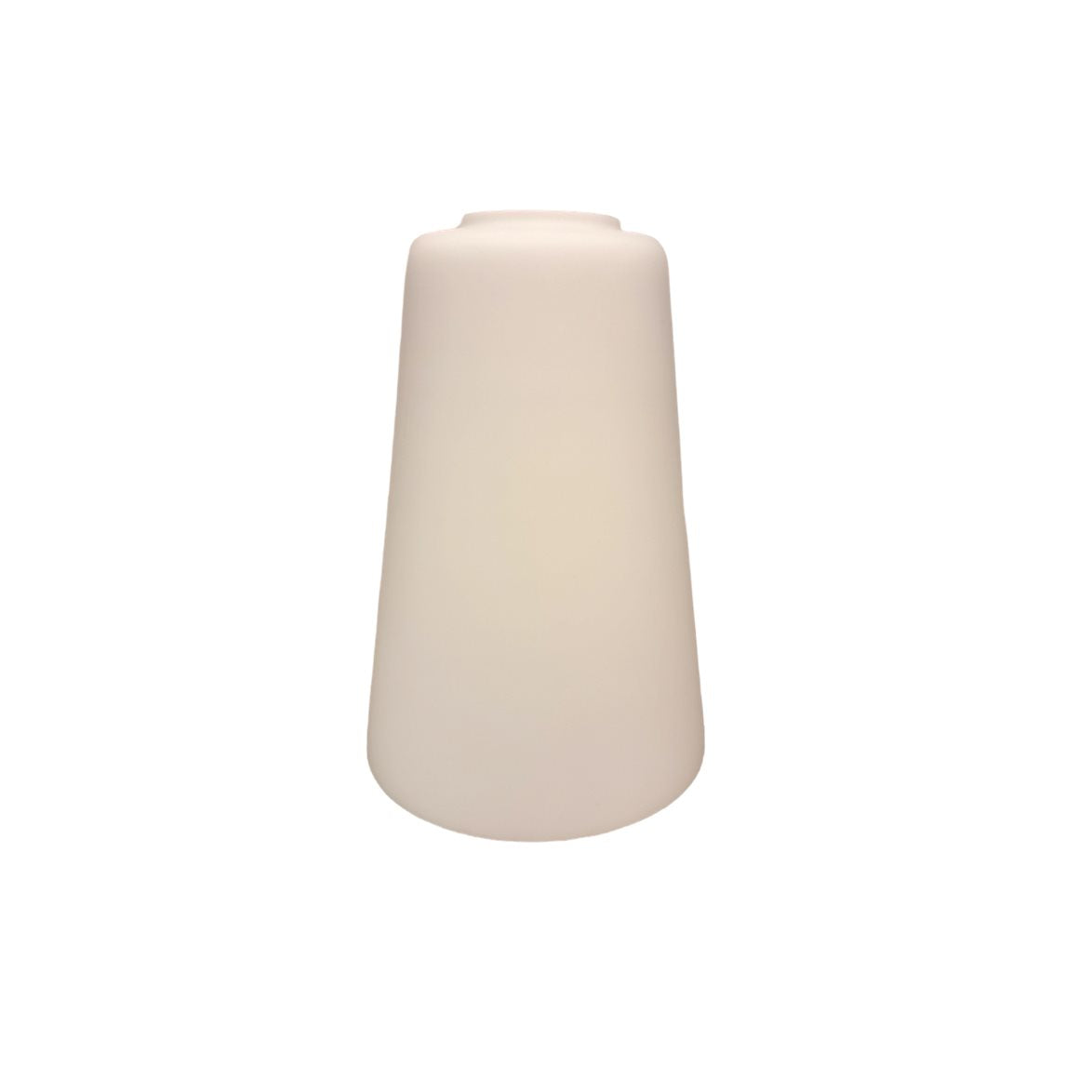 Det här lampglaset är matt opalvitt och med ett hål upptill för en E27 sockel. Det är ett reservglas till Anetas taklampan "Plankan" som har funnits i många år men självklart kan man använda detta glas till annat. Glaset är 180mm högt och 120mm i diameter nertill. (Levereras från 1 april-2025)