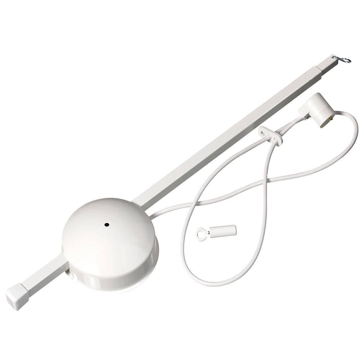 Armaturförlängare. Taklampsförlängare. Det finns många tillfällen i livet när Du kommer vilja hänga taklampan på ett annat ställle än där takkroken sitter. Har Du ett betongtak, kunskap, redskap och framför allt tillåtelse är det naturligtvis bara att ta fram slagborrmaskinen och borra upp ett nytt hål för kroken, men det är inte alltid så lätt. Livet är en hinderbana av bland annat studentrum, andrahandskontrakt och hyresvärdar som kan sätta stopp för dina takkroksplaner och belysningsvisioner, men med Långe-Jan finns det en genväg. Den här produkten är en finurlig uppfinning som gör det möjligt att flytta en lampa i taket från sitt ursprungliga ställe utan att sätta upp en ny takkrok. Långe Jan utgörs nämligen av en vit takkopp anpassad för takkrok, en inbyggd teleskoparm och en sladd med lamppropp som löper parallellt med den. Det Du behöver göra är att hänga Långe-Jan på den gamla kroken, dra ut den justerbara armen till ett lämpligt läge och ansluta din taklampa. Långe-Jan är justerbar i längd mellan 530-930 mm. Den här produkten klarar en tyngd på 2,5kg, men tänk på att inte belasta den så tungt i ytterläge. Långe-Jan är tillverkad för svenska AH-Belysning