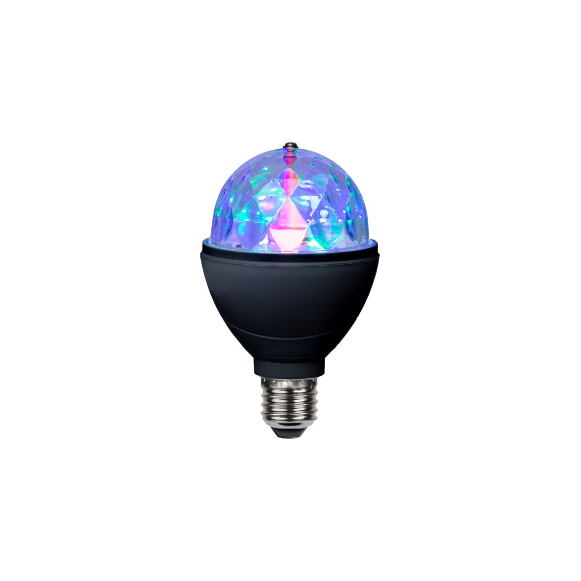 Lampa med E27 sockel och med roterande ljus i läckra färger s k RGB. Höjd 13 cm och 8 cm i diameter. 230 - 240V.