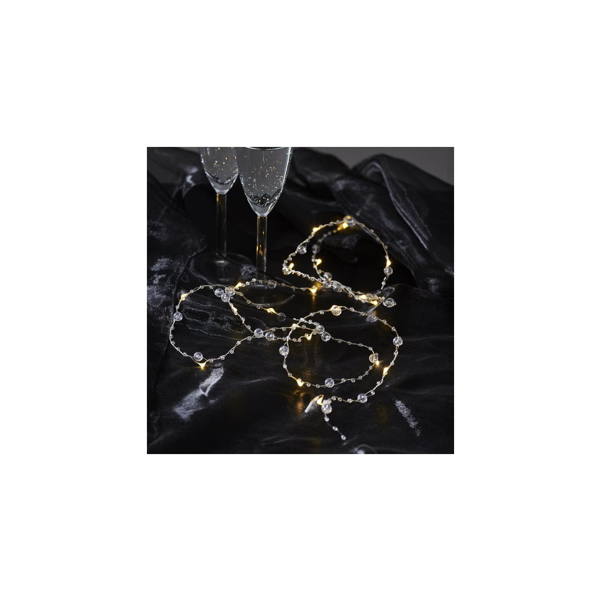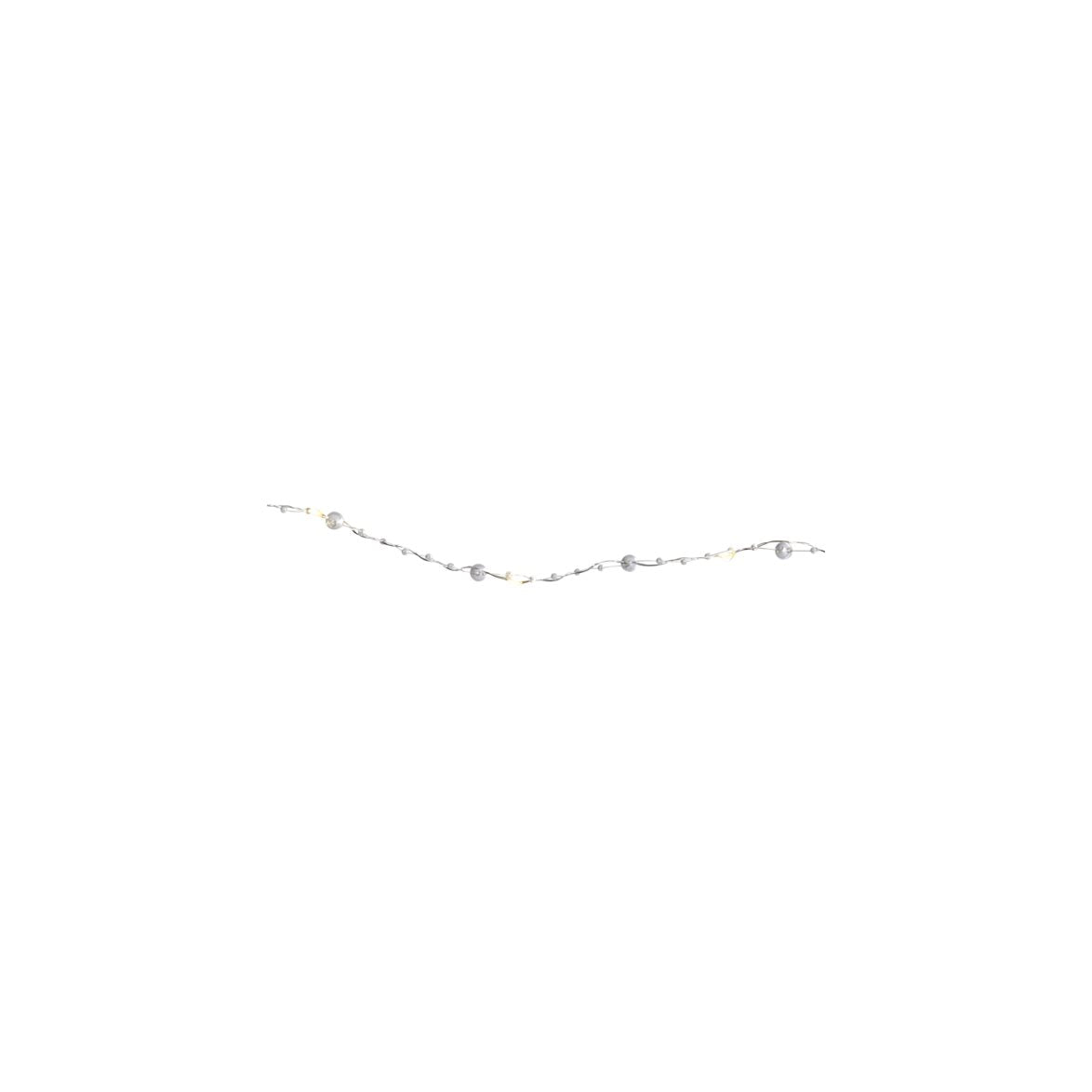 Denna söta ljusslinga drivs med 3st AA batterier. Den är 1,9 meter och har små klara pärlor dekorerade runt den silverfärgade slingan.