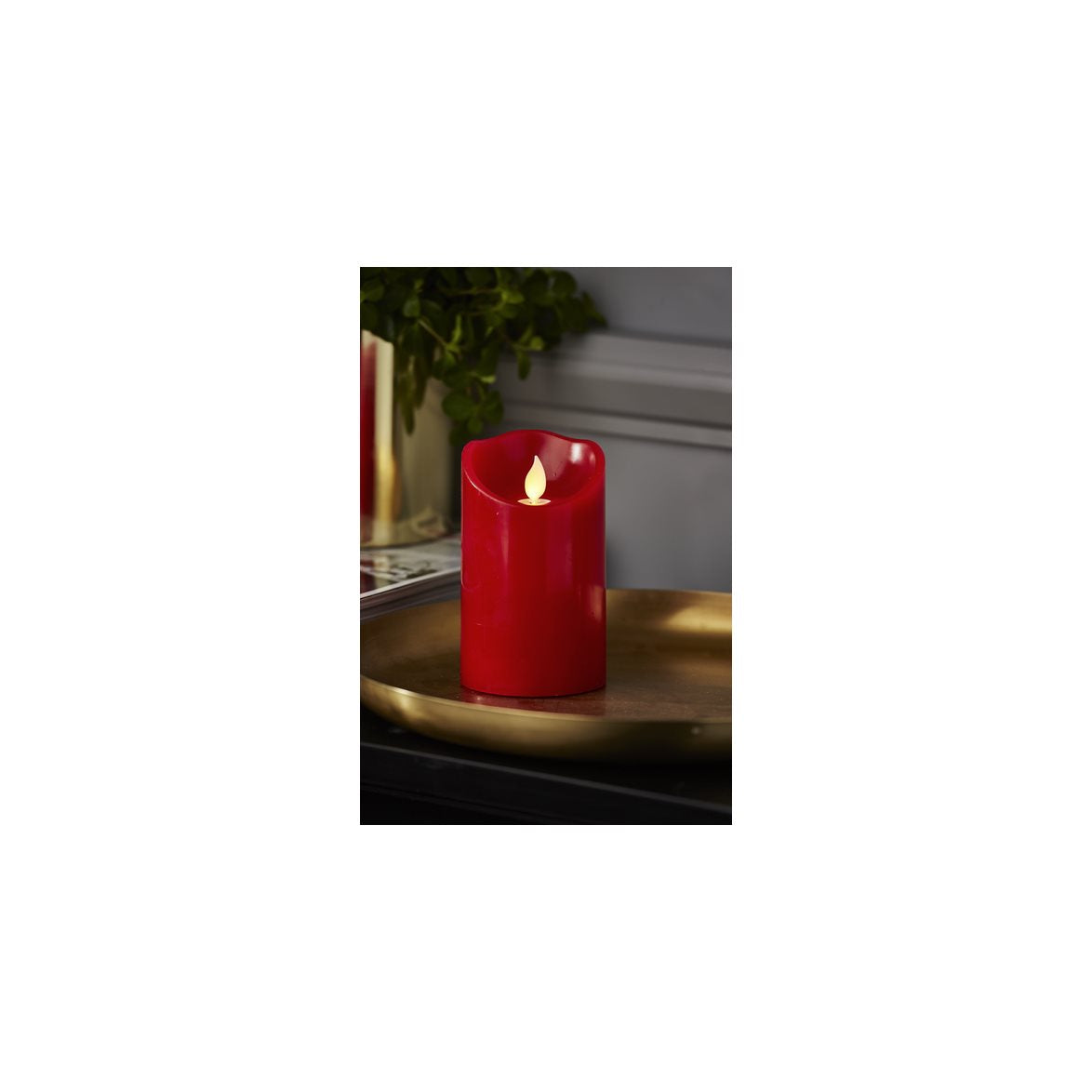 Det här är ett vackert batterljus i röd vax med timer. Lågan lyses upp av LED som gör att lågan flämtar på ett naturtroget sätt. Det här ljuset finns i tre olika höjder varav denna är 125mm hög och 75mm i diameter. Ljuset M-Twinkle ska bestyckas med två stycken AA batterier.