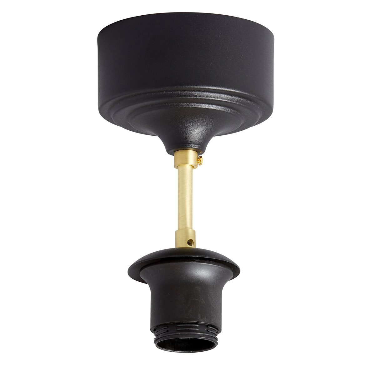 Malung är ett plafondfäste från AH-Belysning i svart och mässing. Klart för krokupphäng och med en E27 sockel med skärmring. Du måste alltså ha ett lampglas med hål i botten så att du kan dra fast glaset på insidan. Vi rekommenderar att du kompletterar detta fäste med glaset "Falun" som både finns i klart och rökfärgat glas. Det följer inte med någon lamppropp och ljuskälla med Malung. Fästet är 160mm högt och 110mm i diameter.