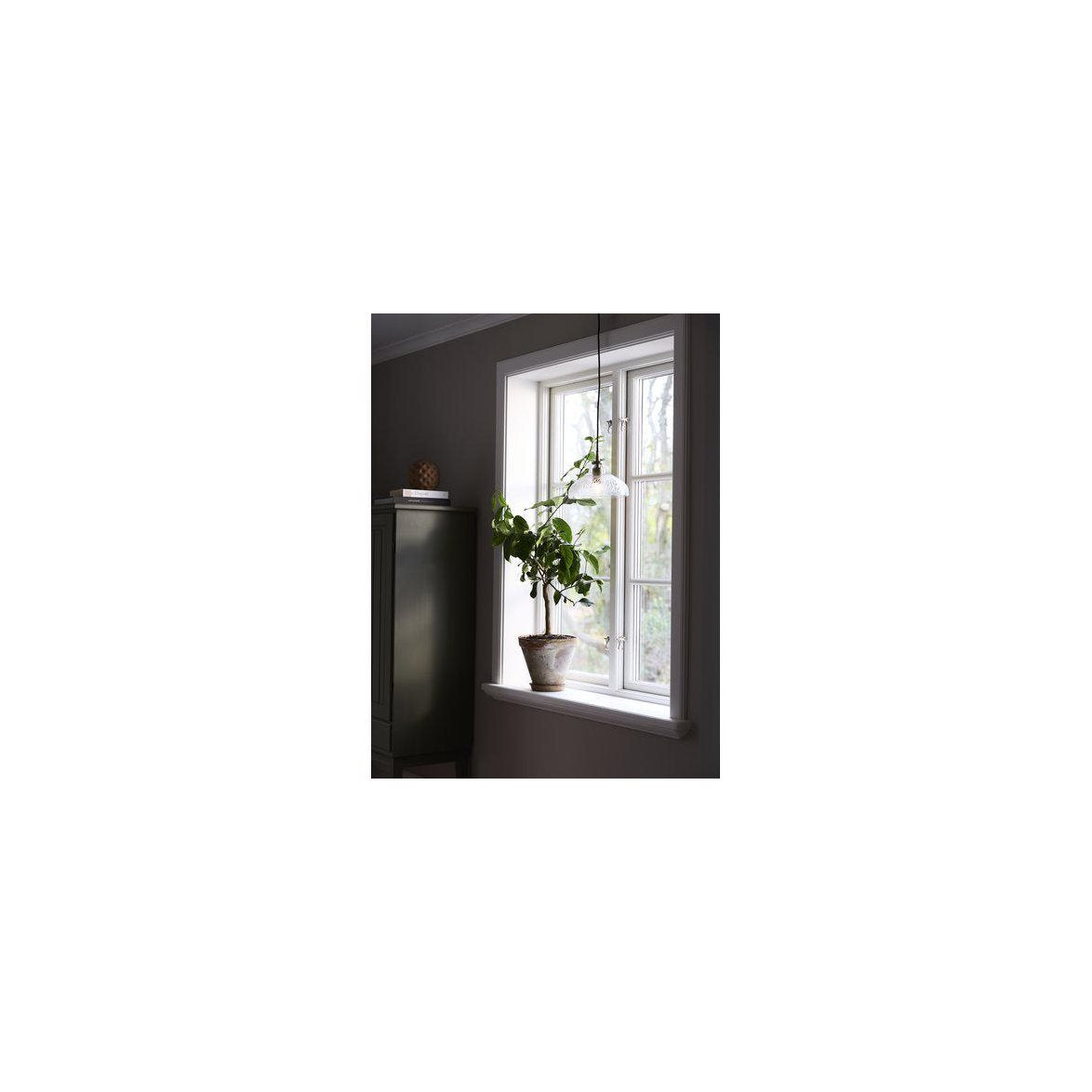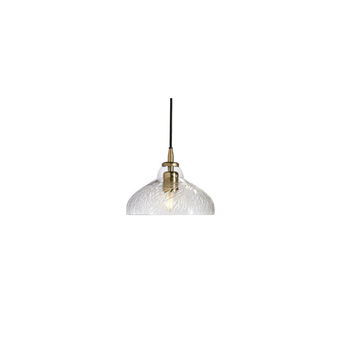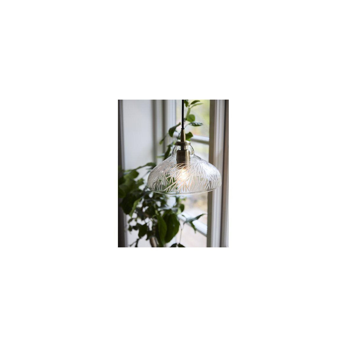 Maple taklampa i vackert handblåst klarglas med utskuret bladmönster som gör varje lampskärm unik. Diameter 20cm, höjd 24cm. Metalldetaljer i mässing med E27 sockel och en 1,35 meter lång tidstypisk svart sladd med krokupphägning som döljs av en svart takkopp. Tänk på att takkontakt och ljuskälla köps separat.