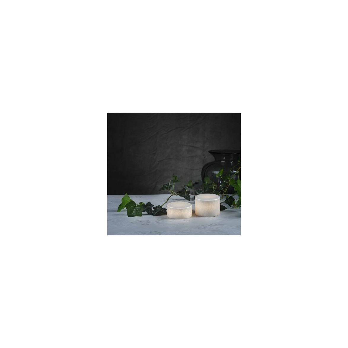 Detta är en marmordekoration med LED-ljus inbyggt. Den drivs med två AA-batterier och finns i två olika höjder och två olika färger. Vacker bordsdekoration!