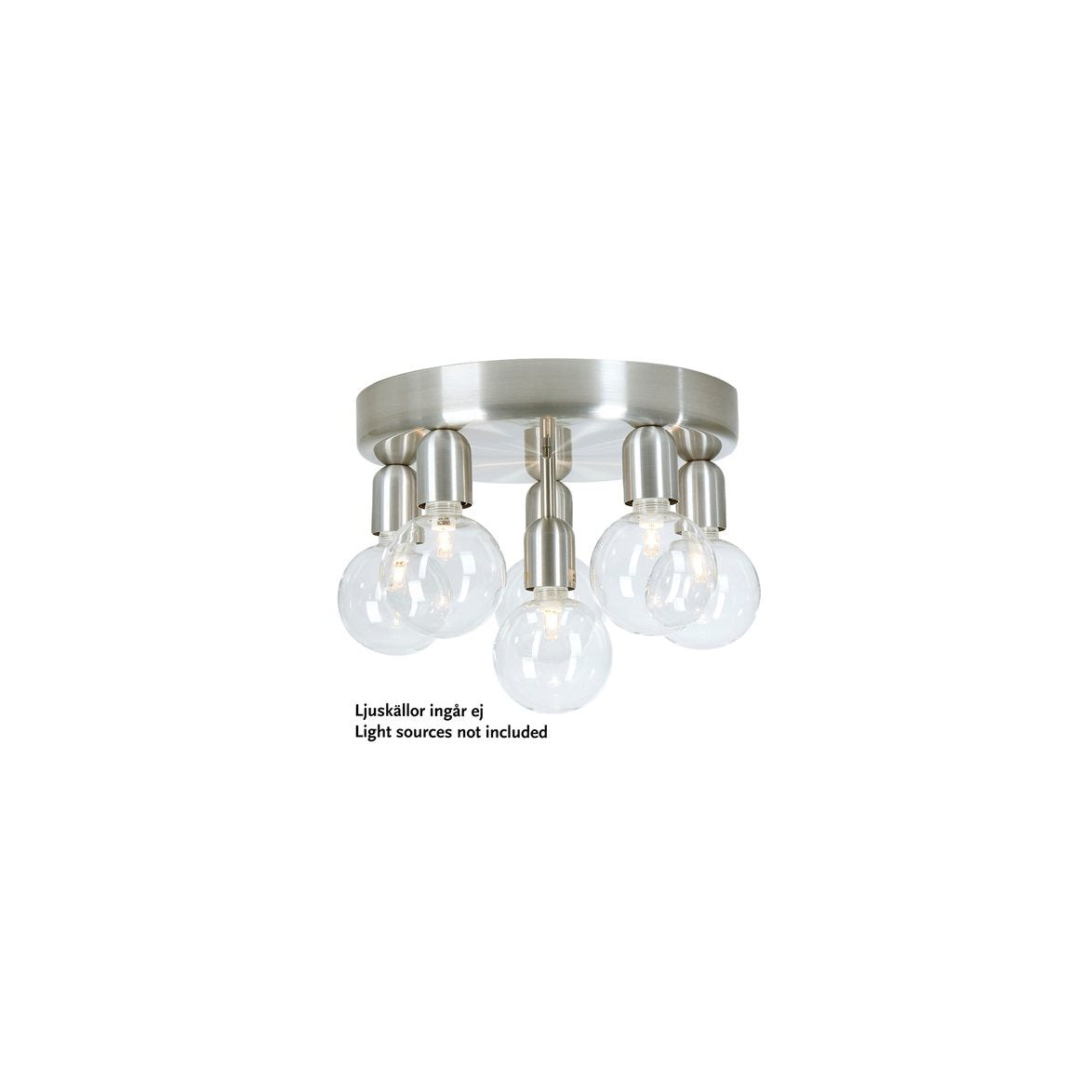 Regal plafond är en taklampa i mattborstad aluminium från svenska Belid. Den här taklampan har sex stycken ljushållare som är arrangerade som stearinsljusen på en gammaldags luciakrona. Plafonden har en cirkulär aluminiumfärgad bas med mjukt rundade kanter. Denna platta har fem stycken lamphållare i cylinderform som omger den sjätte, något upphöjda, lamphållaren i mitten. Till den här plafonden ingår inga ljuskällor och således väljer Du själv ljuskällor efter de egenskaper som du tycker stämmer överens med dina önskemål gällande belysningen. Vi på A-ljus tycker att det här är en modern plafond med vinkningar till elektricitetens barndom där ljuskällorna var en dekorationsdetalj i sig, vi dekommenderar därför att komplettera denna plafond med en snygg LED filament. Regal plafond är tillverkad i Sverige för svenska Belid.