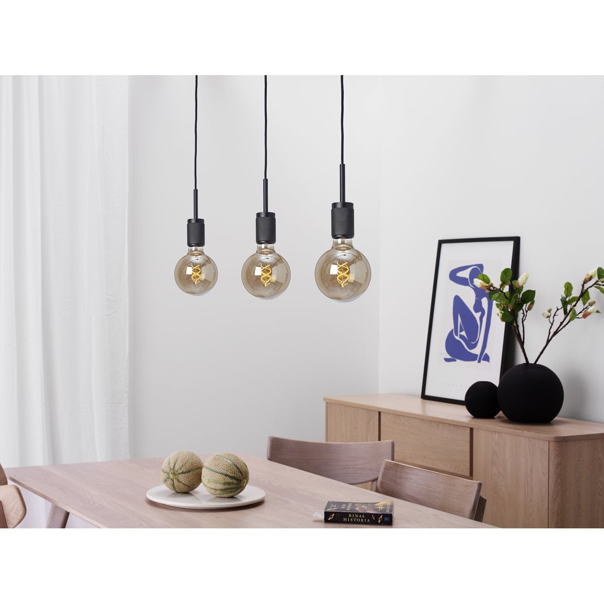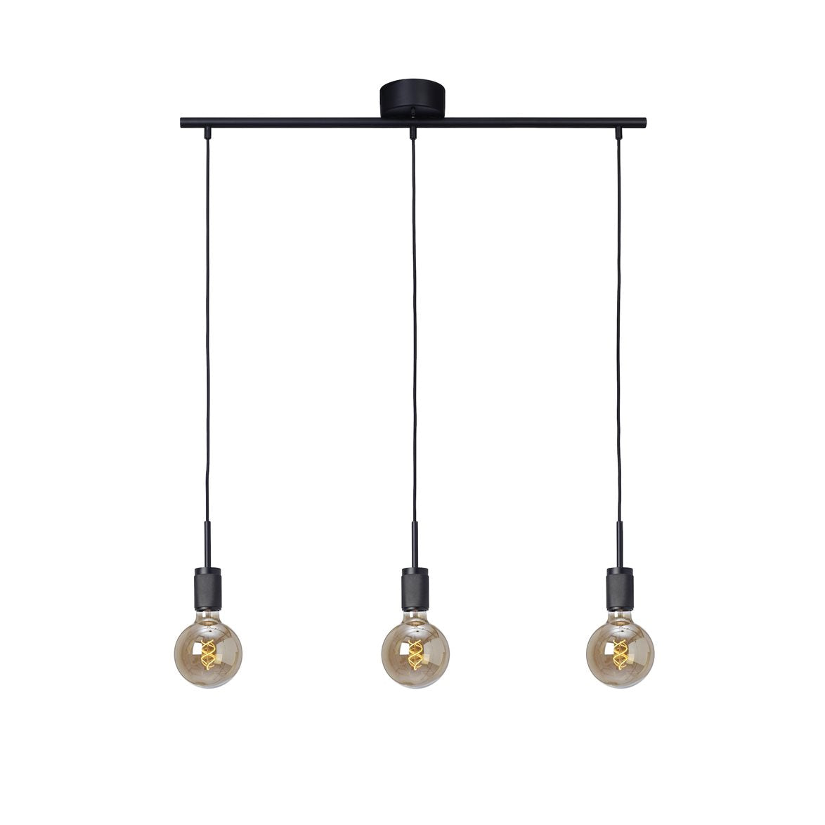 Rille är enkel med effektfull taklampa med tre hängande fästen för E27 globljuskällor i ett fäste för krokupphäng. Hela armaturen är svart och sladdarna är justervara i höjd.