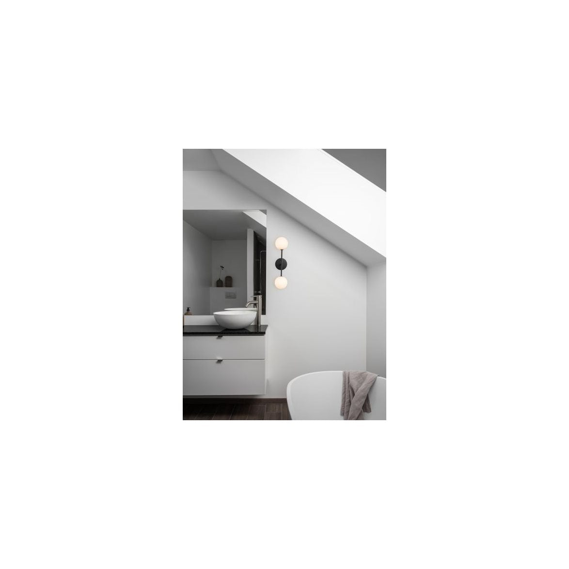 Sigma är en badrumsvägglampa från PR Home i matt svart med två stycken opalvita glas. Den är 360mm hög och 120mm bred, 190mm djup och är bestyckas med två stycken G9-ljuskällor 3000K som ingår. IP-klass 23