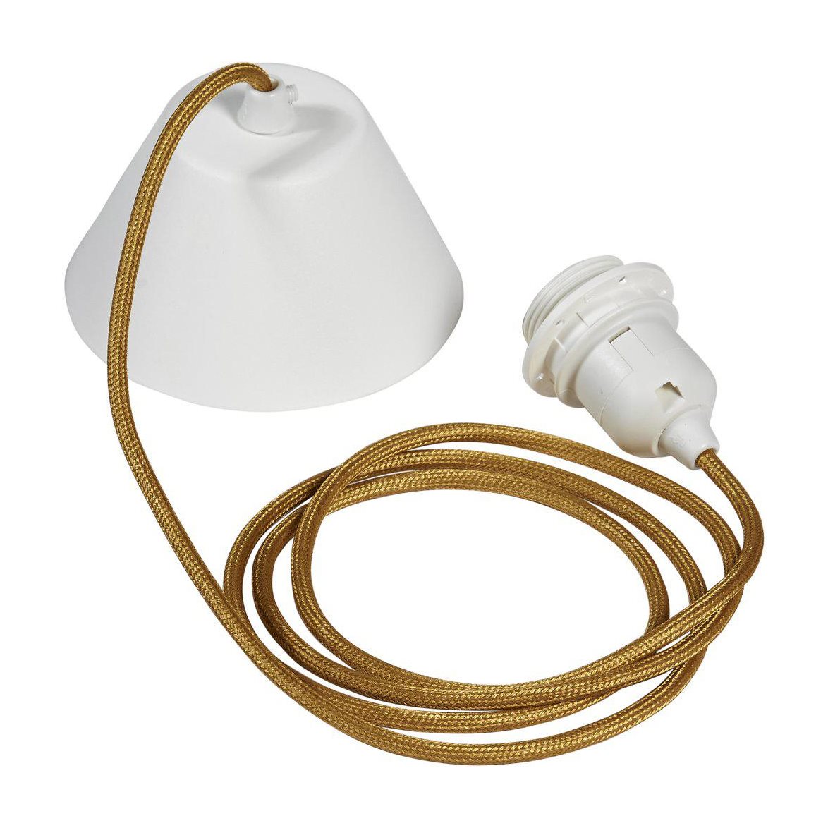 Det här är ett guldfärgad takupphäng med textilsladd från svenska PR Home. Upphänget utgörs av en sladd, en gängad fattning för ljuskällor med sockelstorleken E27 och en konformad takkopp i plast. Takfästet passar till lampskärmar av textil, papper och ris.
