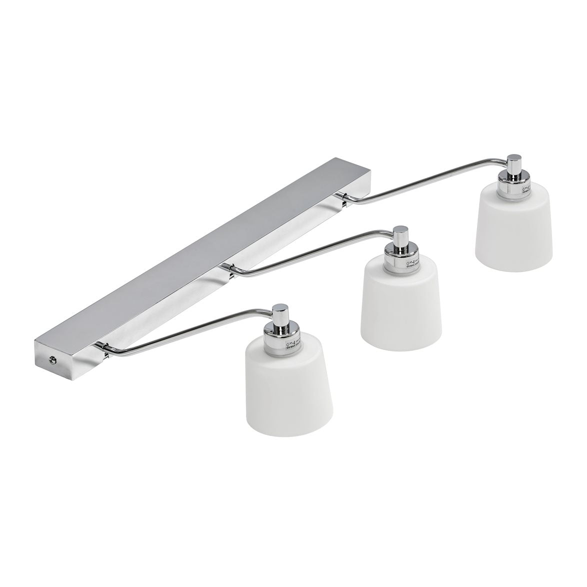 Den här armaturen heter Tärnö och är anpassad för montage ovanpå ett badrumsskåp. Fästet är i krom och de tre kuporna är opalvitt glas. Varje kupa ska bestyckas med en ljuskälla med G9-sockel. Dessa medföljer inte.