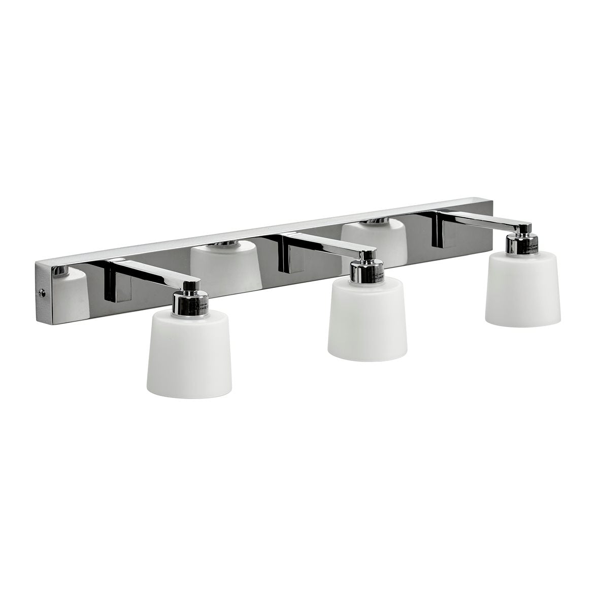 Den här armaturen heter Ulvö och er en badrumsvägglampa från AH-Belysning. Den ska monteras på vägg och passar utmärkt över en spegel. Fästet är i krom och glasen är opalvita. Varje kupa ska bestyckas med en ljuskälla med G9-sockel. Ljuskällor medföljer inte.