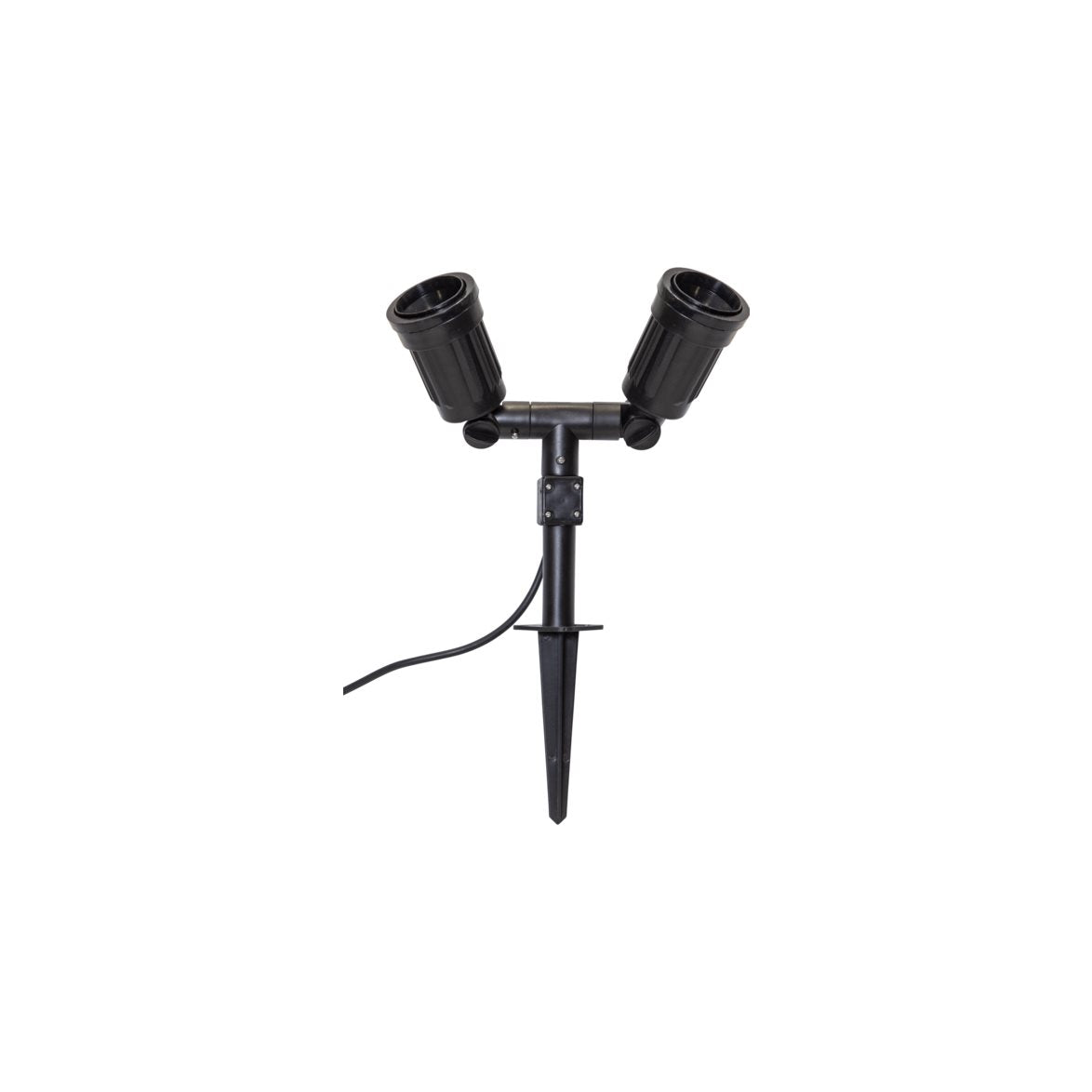 Duospotlight är försedd med markspett för utomhusbruk. I den sätter man PAR38 LED-lampa med E27 sockel. I artikeln ingår 5 meter IP44 gummikabel. En bra lampa att lysa upp träd och buskar i trädgården. Säljs utan ljuskälla. Avsedd för 230V.