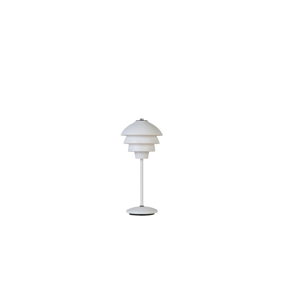 Valencia är en söt bordslampa som ingår i serien med samma namn från svenska Belid. Den är vit och 410mm hög och 180mm i diameter. I de välvda bländskydden sitter ljuskällan dold för minsta möjliga bländrisk. Ljuskällan medföljer.